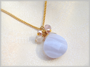 ★ブルーレースのネックレス★ 商品番号026 コメント* ブルーレースが可愛いコロンとしたネックレスです。 長さ:38cm+5cmアジャスター 使用素材:ブルーレース、ローズクォーツ、アメジスト、淡水パール 金具:金色 Price1800yen